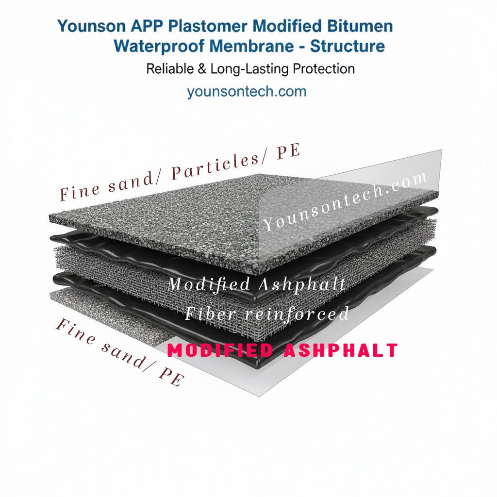 The Younson brand APP (Atactic Polypropylene) plastomer modified bitumen waterproof membrane is manufactured with APP or polyolefin polymers (APAO, APO) as modifiers, with polyester felt as reinforcement. The upper surface is finished with polyethylene film (PE), fine sand (S), or mineral granules (M) as isolation materials, and the lower surface is covered with fine sand or polyethylene film. It is a flexible, roll-type waterproofing material suitable for long-term durability.