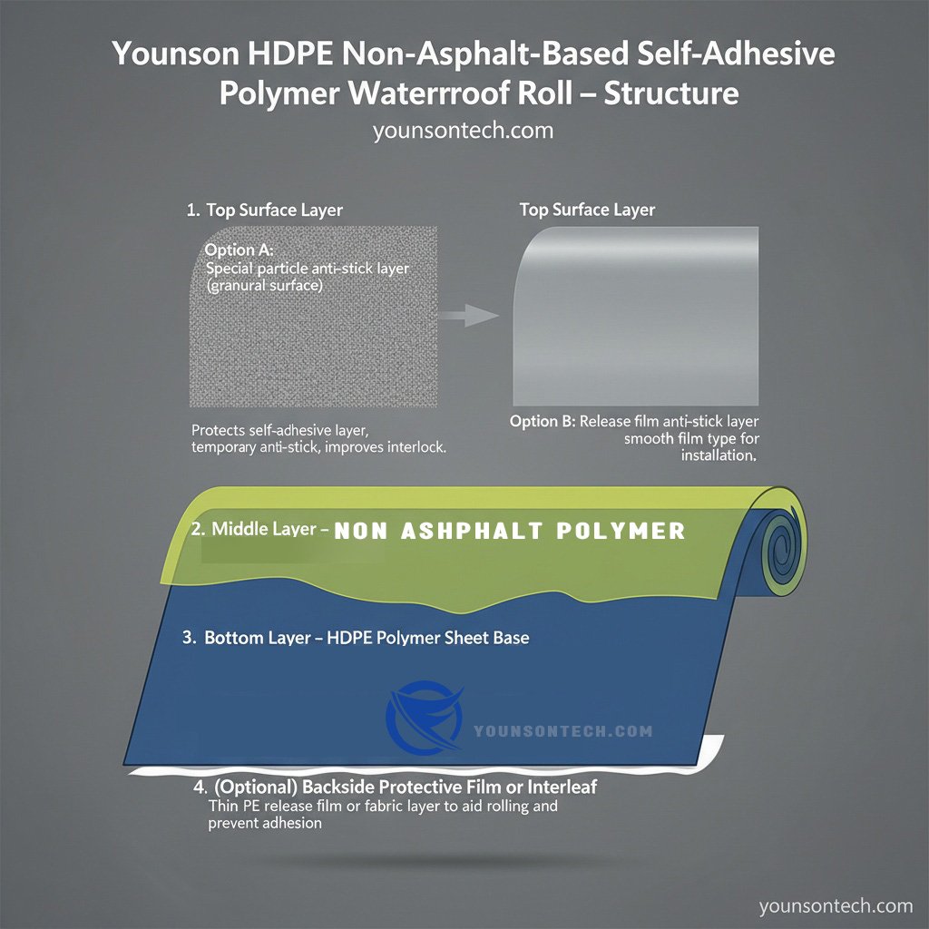 Younson HDPE Non-Asphalt-Based Self-Adhesive Polymer Waterproof Roll is made with an HDPE polymer sheet base, combined with a non-asphalt polymer self-adhesive layer and a special particle anti-stick layer or release film anti-stick layer. It is designed to bond effectively with cast-in-place concrete. Special active substances in the adhesive allow cross-linking with fresh concrete, achieving full microscopic adhesion (pre-laid self-adhesion), preventing water seepage, and forming a “rigid-flexible complementary” waterproof system.